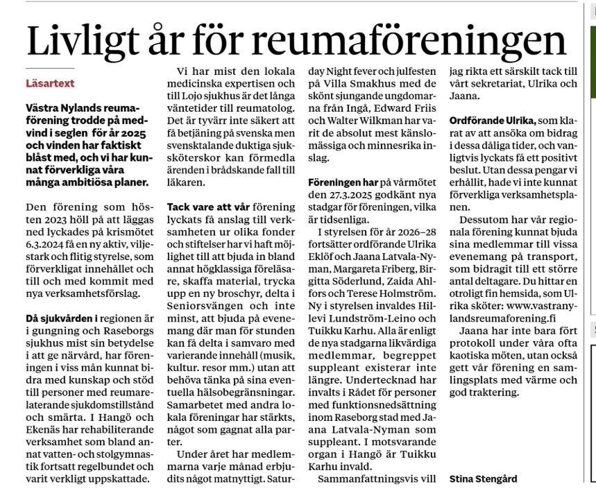 Läsartext i Västra Nyland 23.12.2025 om Västra Nylands Reumaförening rf