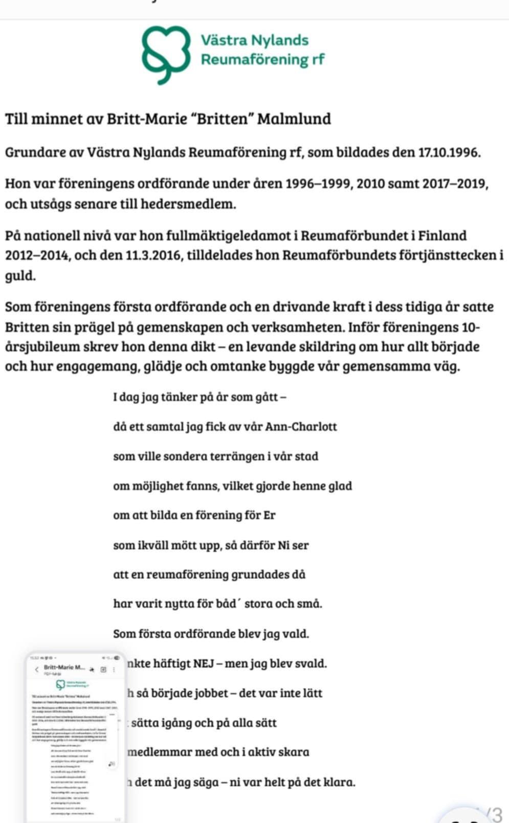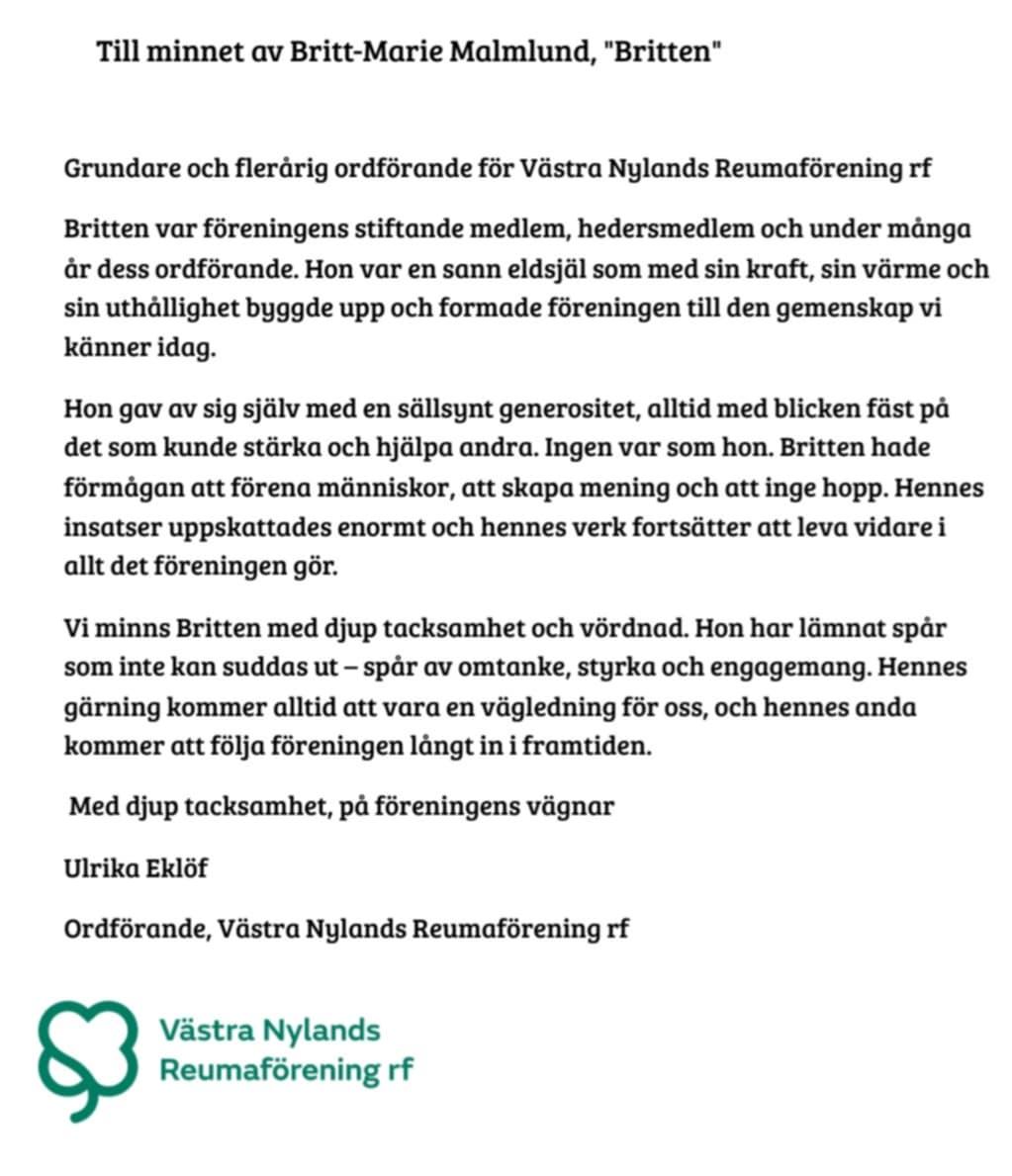 Vi minns föreningens grundare Britt-Marie "Britten" Malmlund